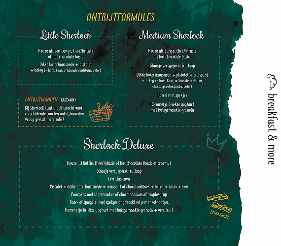 Bij Sherlock draait alles om dat speciale moment van de dag: Het ontbijt. Of je nu zin hebt in een heerlijke bagel, een luxe toast of misschien wel een zoete traktatie, ze hebben het allemaal. En als je haast hebt, kun je zelfs je ontbijtmand laten thuisbezorgen. Handig, toch?